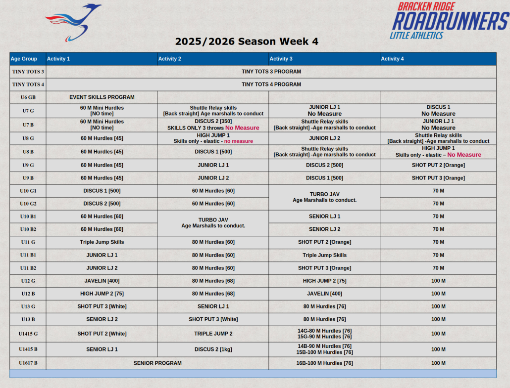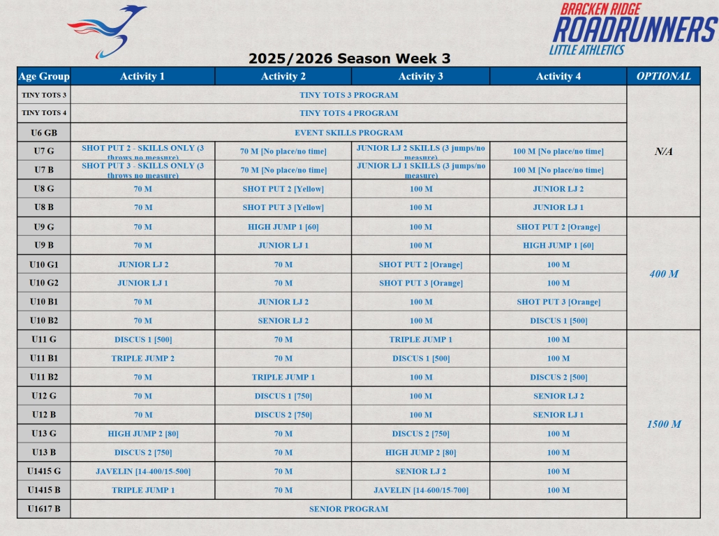 Special Notice: This week, we have optional 400m and 800m events for those looking to test their endurance! Whether you’re aiming for a personal best or just want to challenge yourself, be sure to participate!